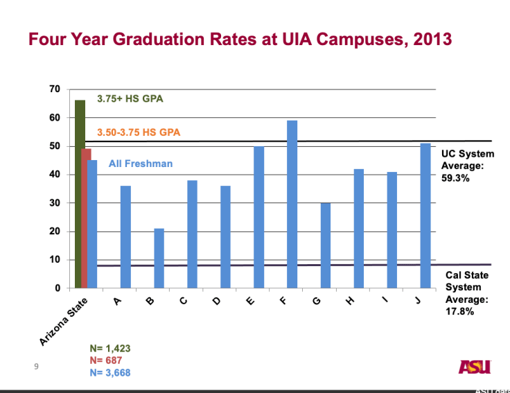 Here, we have diagonal labels on the X-axis. The spacing between each bar in the bar chart, particularly for the Arizona State data point, aren’t adequately stacked. I’m also just generally unsure how any of this relates? What are the letters other than Arizona State communicating? We also sort of have two Y-axis here with the Cal State System and UC systems being represented there randomly. And the N is being represented here, and I’m unsure why.