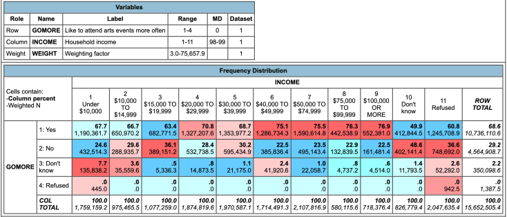 Going a little deeper, with the desire to increase arts participation by attending arts events, we’re cross tabbing this with how much income is earned. This shows that for nearly all income levels, there’s a desire to attend arts events more, showing a willingness to access arts across all income levels, which I think is pretty astounding. We do see a slight increase in the desire to attend more with folks who have more income, but it’s all still pretty high across the board.