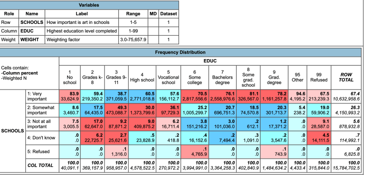 Applying a new lens to the question about the importance of art in schools, we see general agreement that art is “very important” in schools across all the education levels. But I think a couple of interesting outliers is that if they had some high school or a vocation school, then they’re lower than the rest – especially if they’ve only had some high school. This shows a strange space where art isn’t considered important and how efforts could be made to change that.