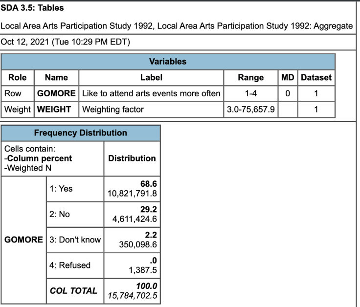 The question I want to explore in this assignment is what does American participation in the arts look like? Collecting and evaluating this data will help us understand the question of what barriers to arts access exist that I’ve been exploring in this class so far this semester. I’m really interested in understanding how much Americans want to engage in the arts and where they place its overall importance in their lives. Although not current, I chose the study titled “Local Arts Participation Study 1992” which was sponsored by the Research Division of the National Endowment for the Arts. This study explored arts participation across 12 sites in the U.S. and for this assignment, I’m exploring the aggregate version.