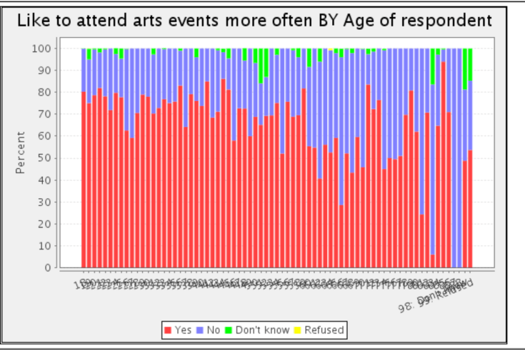 Here’s a breakdown of wanting to attend more art events by age. The table won’t fit on the webpage and this graph is messed up too, which shows a huge need for a recode.